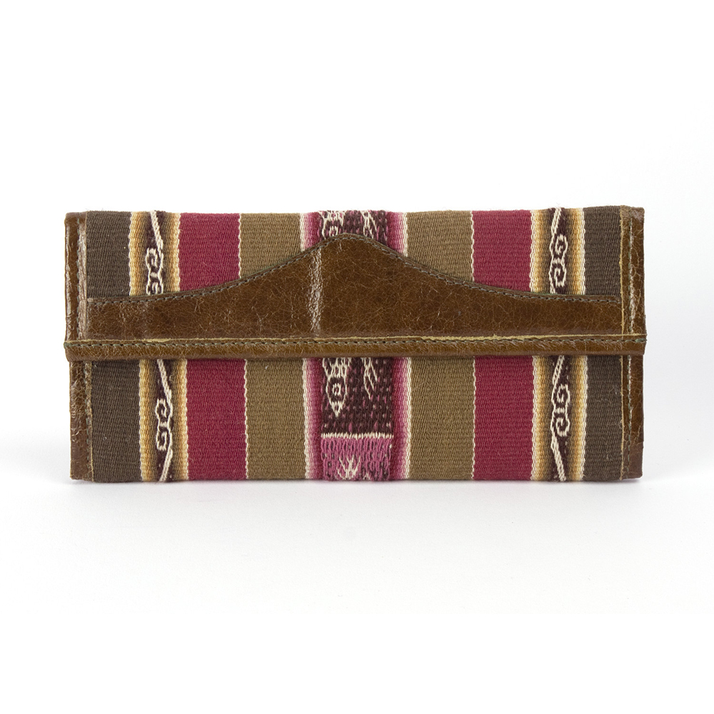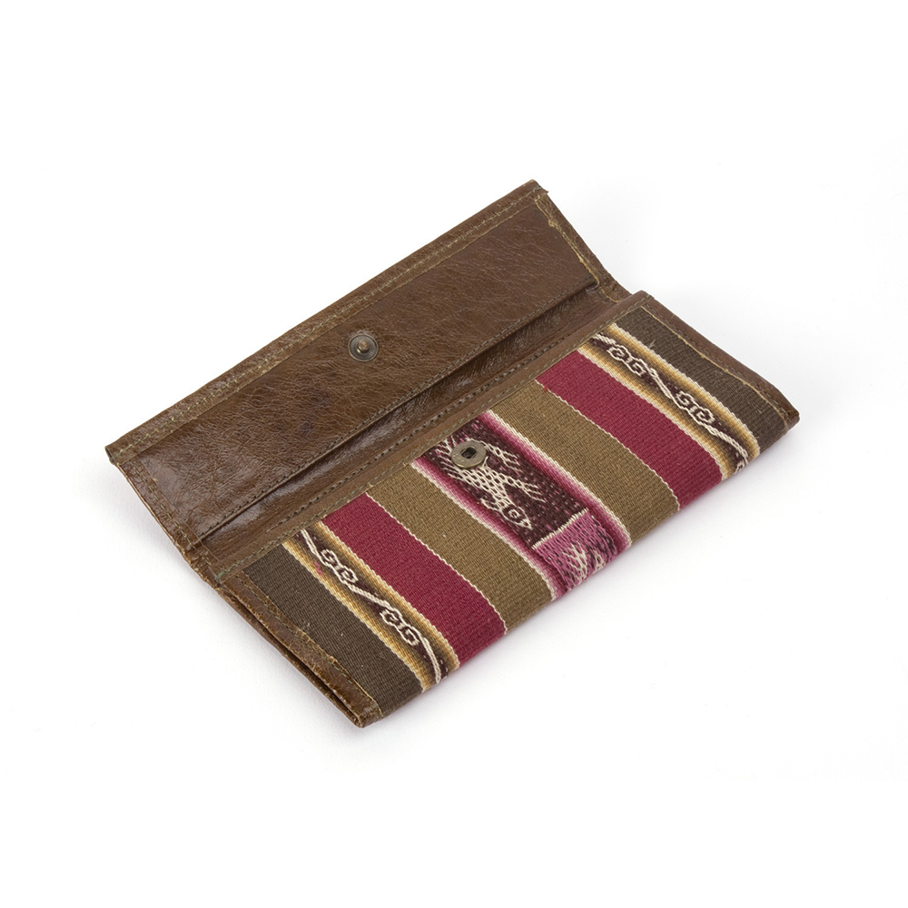 Diese hochwertig verarbeitete Geldbörse aus gewebtem Aguayo-Stoff und Leder lässt sich mit einem Druckknopf schliessen. Sie bietet Platz für Geldscheine und Karten. Auf der Rückseite befindet sich ein Fach für Kleingeld, welches sich mit einem Reißverschluss schliessen lässt.